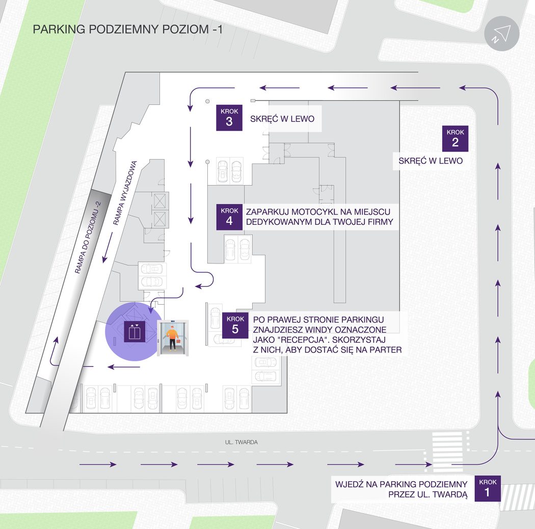 Aby mieć najkrótszą drogę do pracy, zaparkuj na miejscu dedykowanym Twojej firmie, skąd winda zabierze Cię na poziom recepcji.